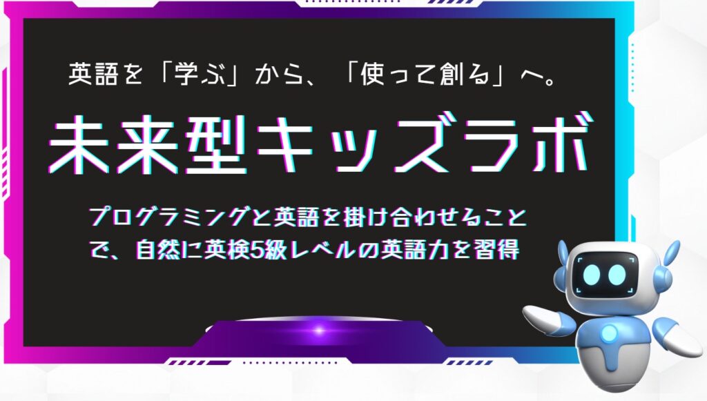 | 未来型キッズラボ | 入会金:15,000円 週1回(90分):15,000円/月 ※兄弟割・紹介割あり ※体験レッスンあり | ・英語 × プログラミングの融合カリキュラム 学ぶだけでなく、英語で命令して動かすことで“使う英語”が身につく。 ・AIを活用した次世代の学び ChatGPTと英語でやり取りしながらアウトプット量を最大化。 ・小学生専門 × 対面指導 小1から安心して始められるやさしい構成。英検にも対応。 |