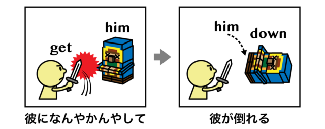 これもマインクラフトの1シーンですが、行商人を切りつけてダウンさせています。切りつけている部分がget himで、そこからhim downとなっています。