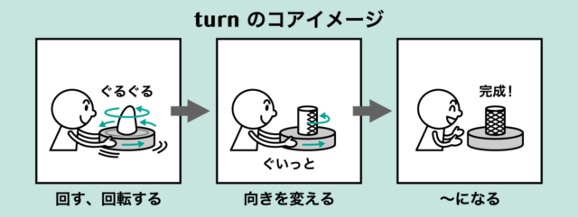 この記事では、それらバラバラに見える turn の意味を、コアイメージから意味の樹形図でつなげて解説します。turn の本当の姿を、ぜひここでつかんでいってください。