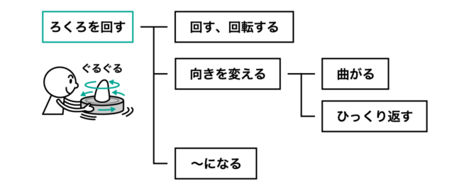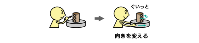 これは土器のような道具を作る工程を想像してもらうとわかりやすいです。ろくろ(旋盤)を回転させて粘土を整形したり、細かい模様付けなどの際にぐいっと向きを変えたりして、最終的に粘土が道具になる。そんな一連の流れで捉えてください。