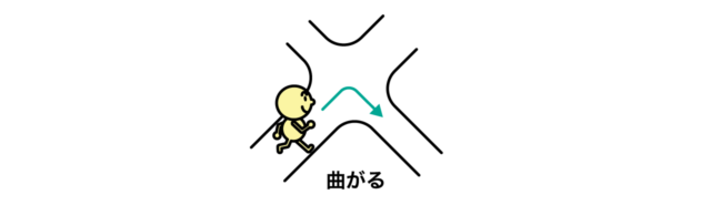 道や角などで進行方向を変えるイメージから「曲がる」という意味が出てきます。